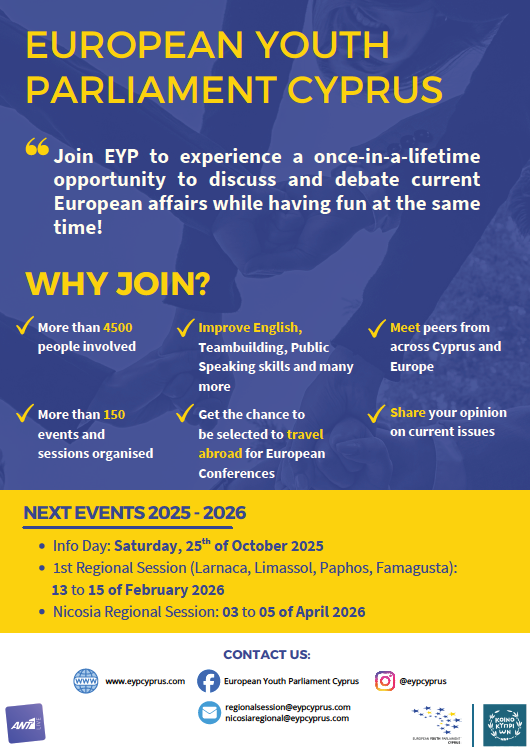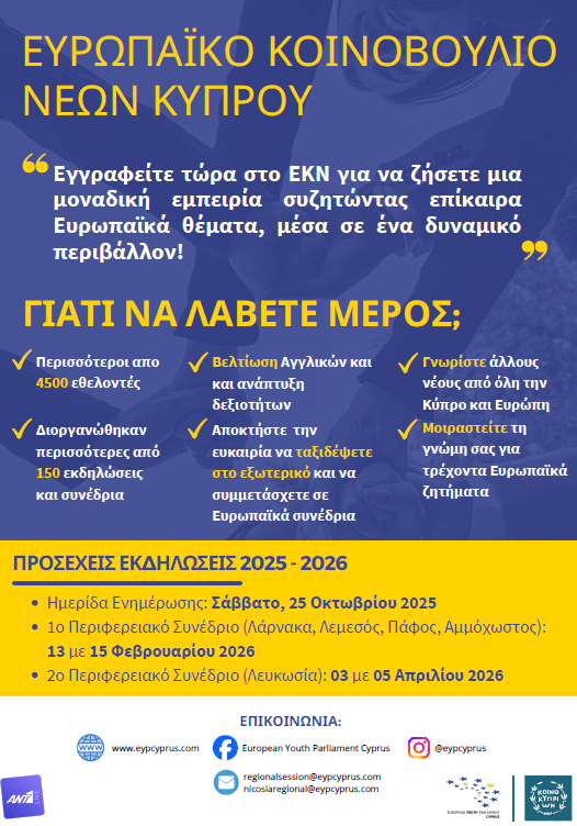Το Διοικητικό Συμβούλιο του Ευρωπαϊκού Κοινοβουλίου Νέων (ΕΚΝ) Κύπρου προσκαλεί τα σχολεία της Κύπρου να λάβουν μέρος σε ένα εκ των δύο Περιφερειακών Συνεδρίων του ΕΚΝ Κύπρου, που θα διεξαχθούν μεταξύ τις 13 με 15 Φεβρουαρίου 2026 για σχολεία και μαθητές από τη Λάρνακα, Λεμεσό, Πάφο και Αμμόχωστο και τις 3 με 5 Απριλίου 2026 για σχολεία και μαθητές από τη Λευκωσία. Και τα δύο συνέδρια απευθύνονται τόσο σε σχολικές αντιπροσωπείες όσο και σε μαθητές οι οποίοι επιθυμούν να λάβουν μέρος ατομικά.