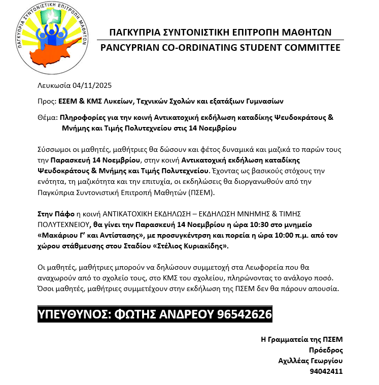 ΕΠΑΡΧΙΑΚΗ ΣΥΝΤΟΝΙΣΤΙΚΗ ΕΠΙΤΡΟΠΗ ΜΑΘΗΤΩΝ ΠΑΦΟΥ(ΕΣΕΜ ΠΑΦΟΥ)Αγαπητοί συμμαθητές/συμμαθήτριες, Σύσσωμη, η ακαδημαϊκή κοινότητα, μαθητές όλων των Λυκείων, Εξατάξιων Γυμνασίων και Τεχνικών σχολών της Πάφου θα δώσουν και φέτος δυναμικά και μαζικά το παρόν τους στην κοινή εκδήλωση καταδίκης για την ανακήρυξη του ψευδοκράτους και Μνήμης και Τιμής Πολυτεχνείου στις 14/11. Την Παρασκευή 14 Νοεμβρίου και ώρα 10:30 στο Μνημείο Μακαρίου Γ΄ και Αντίστασης θα πραγματοποιηθεί η εκδήλωση. Όλα τα Κ.Μ.Σ να κατευθύνουν τους μαθητές, είτε πεζούς, είτε με λεωφορεία στο χώρο στάθμευσης του Παφιακού Σταδίου όπου θα γίνει προσυγκέντρωση και κοινή πορεία όλων των σχολείων προς το χώρο της εκδήλωσης. Oι μαθητές όλων των σχολείων θα πρέπει να βρίσκονται στο χώρο στάθμευσης του Παφιακού Σταδίου μέχρι τις 10:00. Ώρα αποχώρησης από τα σχολεία μέχρι τις 09:30. Θα πρέπει να είναι ξεκάθαρο ότι η επιτυχία της φετινής εκδήλωσης εξαρτάται από όλους μας. Ιδιαίτερη βαρύτητα θα πρέπει να δοθεί στην τήρηση και σεβασμό του πλαισίου των πανό και των συνθημάτων. Τρόπος μεταφοράς των μαθητών για την εκδήλωση είναι ο ακόλουθος:
