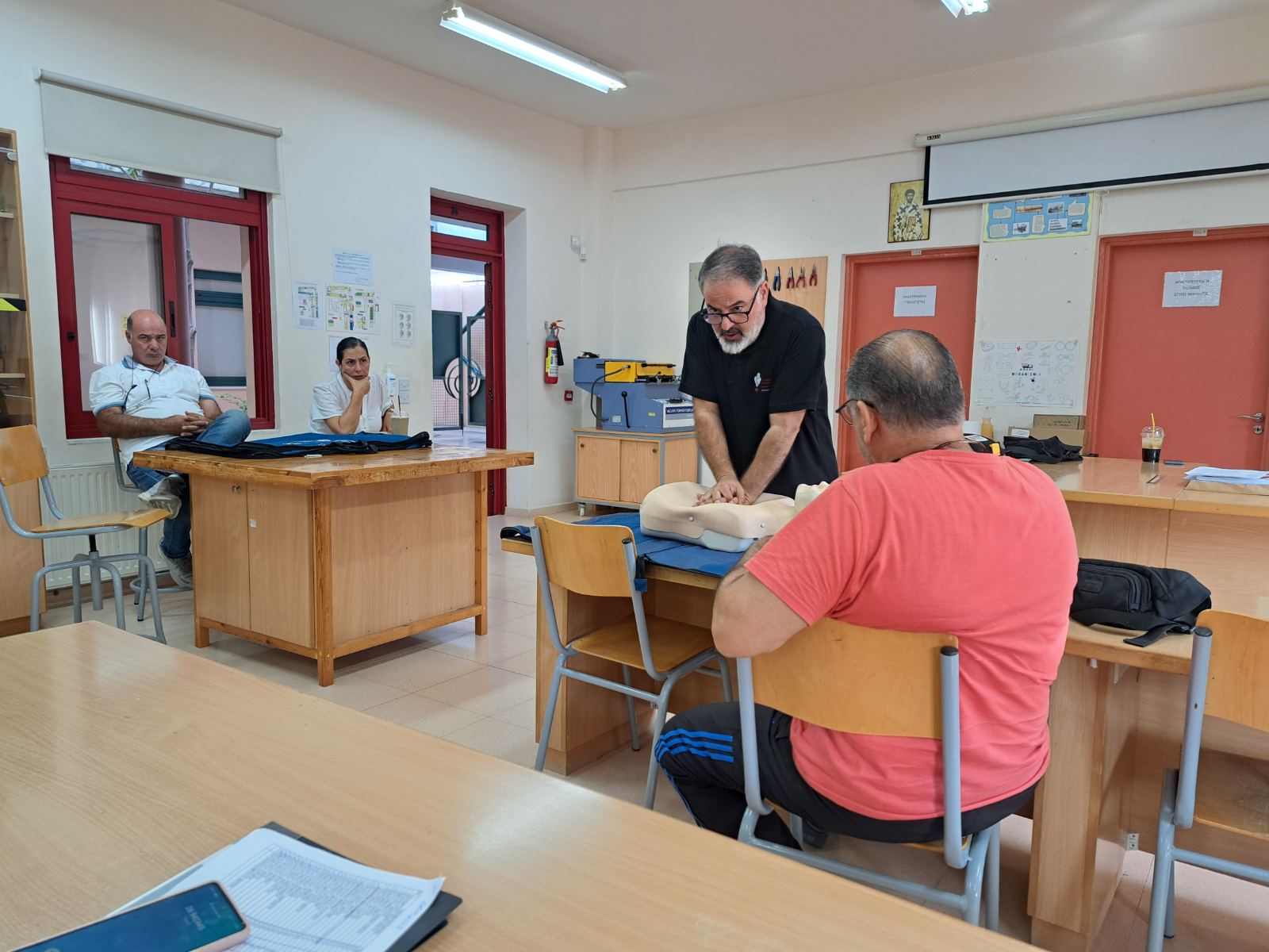 Οι συμμετέχοντες είχαν την ευκαιρία να ενημερωθούν και να εκπαιδευτούν στη σωστή χρήση του απινιδωτή, με στόχο την ενίσχυση της ετοιμότητας και της ασφάλειας στον χώρο του σχολείου.