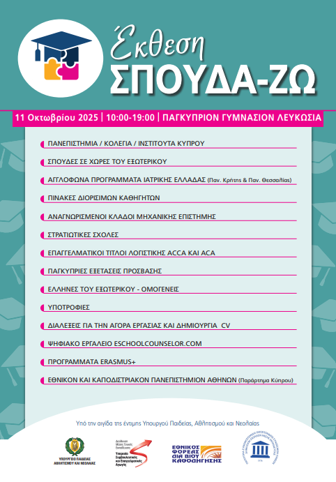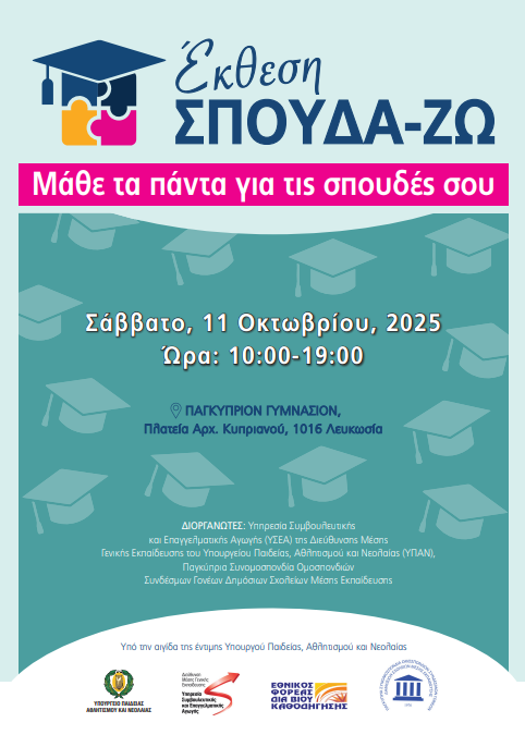 Η Υπηρεσία Συμβουλευτικής και Επαγγελματικής Αγωγής (ΥΣΕΑ) της Διεύθυνσης Μέσης Γενικής Εκπαίδευσης (ΔΜΓΕ) του Υπουργείου Παιδείας, Αθλητισμού και Νεολαίας, σε συνεργα σία με την Παγκύπρια Συνομοσπονδία Ομοσπονδιών Συνδέσμων Γονέων Δημοσίων Σχολείων Μέσης Εκπαίδευσης και τη στήριξη του Κυπριακού Συνδέσμου Καθηγητών / Καθηγητριών Σ.Ε.Α. (ΟΕΛΜΕΚ), διοργανώνει Επαρχιακές Εσπερίδες Επαγγελματικής Συμβουλευτικής με θέμα: «O τρόπος πρόσβασης στη Δημόσια Τριτοβάθμια Εκπαίδευση Κύπρου και Ελλάδας: Παγκύπριες Εξετάσεις Πρόσβασης 2025».