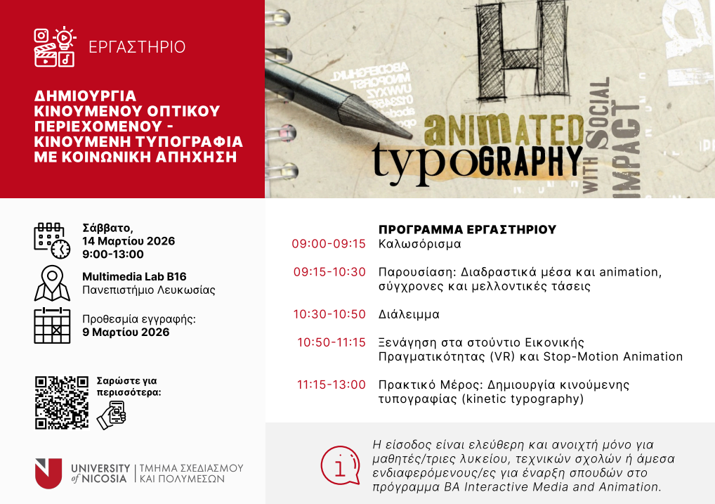 Το πρόγραμμα Διαδραστικά Μέσα και Κινούμενο Σχέδιο του Τμήματος Σχεδιασμού & Πολυμέσων προσκαλεί τους μαθητές/τριες σας να συμμετάσχουν σε ένα εργαστήριο όπου θα μάθουν πώς να δίνουν κίνηση στις λέξεις, δημιουργώντας εντυπωσιακά animated μηνύματα με το Adobe Animate CC. Οι συμμετέχοντες μέσα από τον δημιουργικό συνδυασμό τυπογραφίας, χρώματος και κίνησης, θα ανακαλύψουν πώς ο οπτικός σχεδιασμός μπορεί να μεταφέρει ιδέες που αγγίζουν και προβληματίζουν όπως για παράδειγμα κοινωνικά ζητήματα ή και προσωπικές τοποθετήσεις.