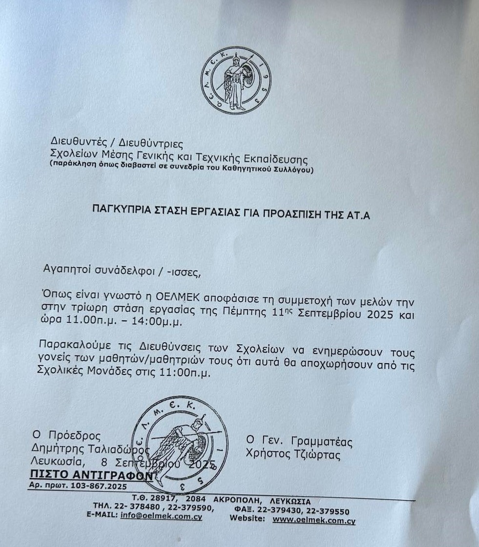 ΠΑΓΚΥΠΡΙΑ ΣΤΑΣΗ ΕΡΓΑΣΙΑΣ ΓΙΑ ΠΡΟΑΣΠΙΣΗ ΤΗΣ Α.Τ.Α.